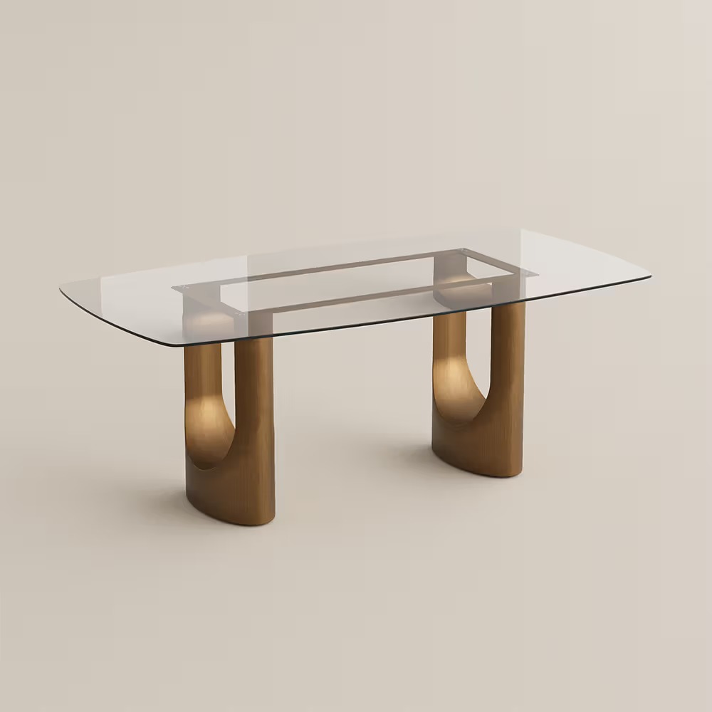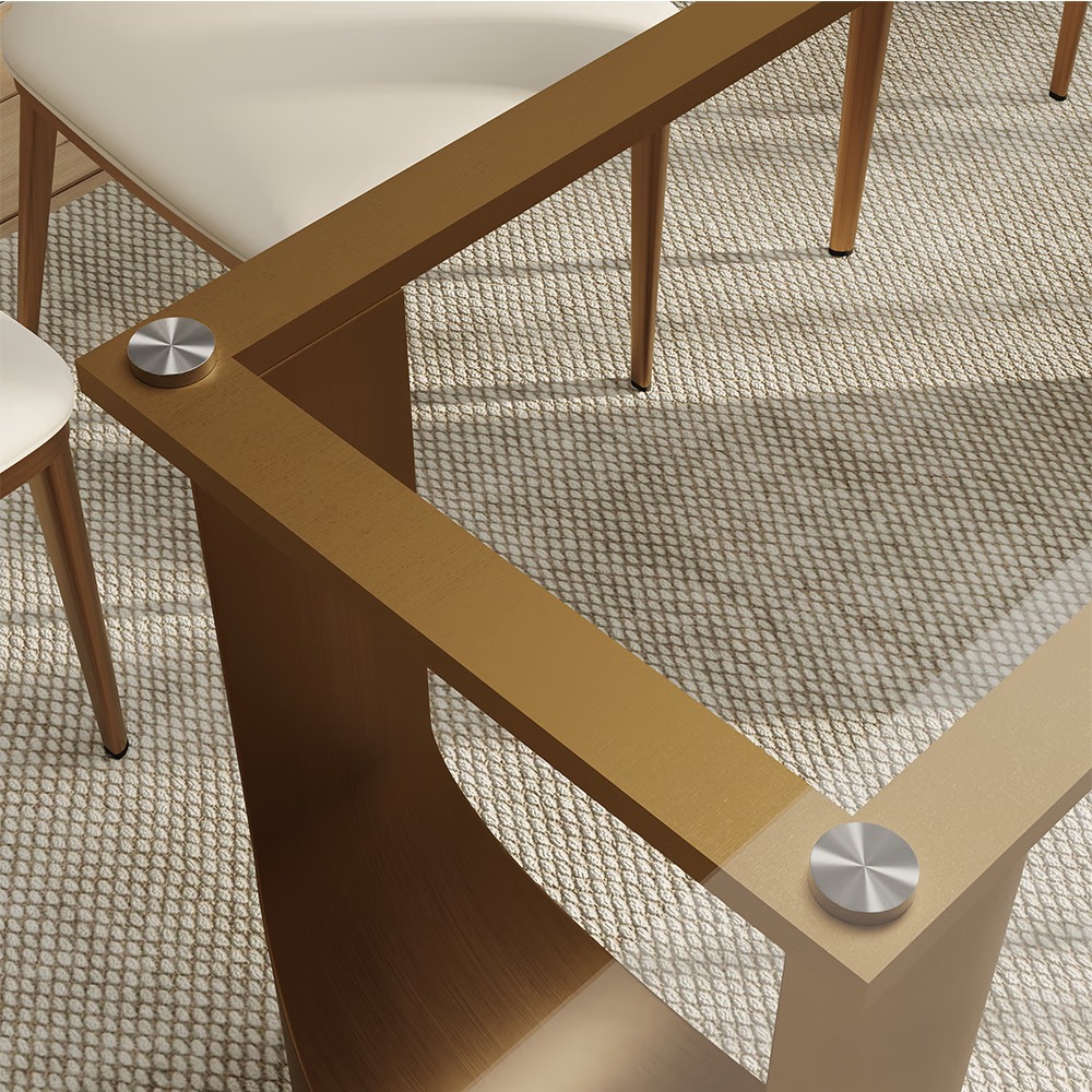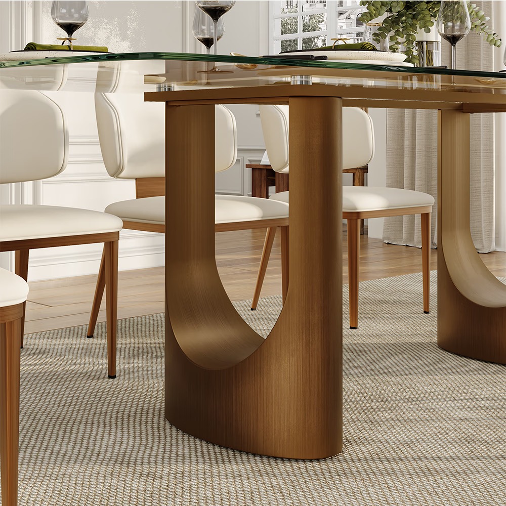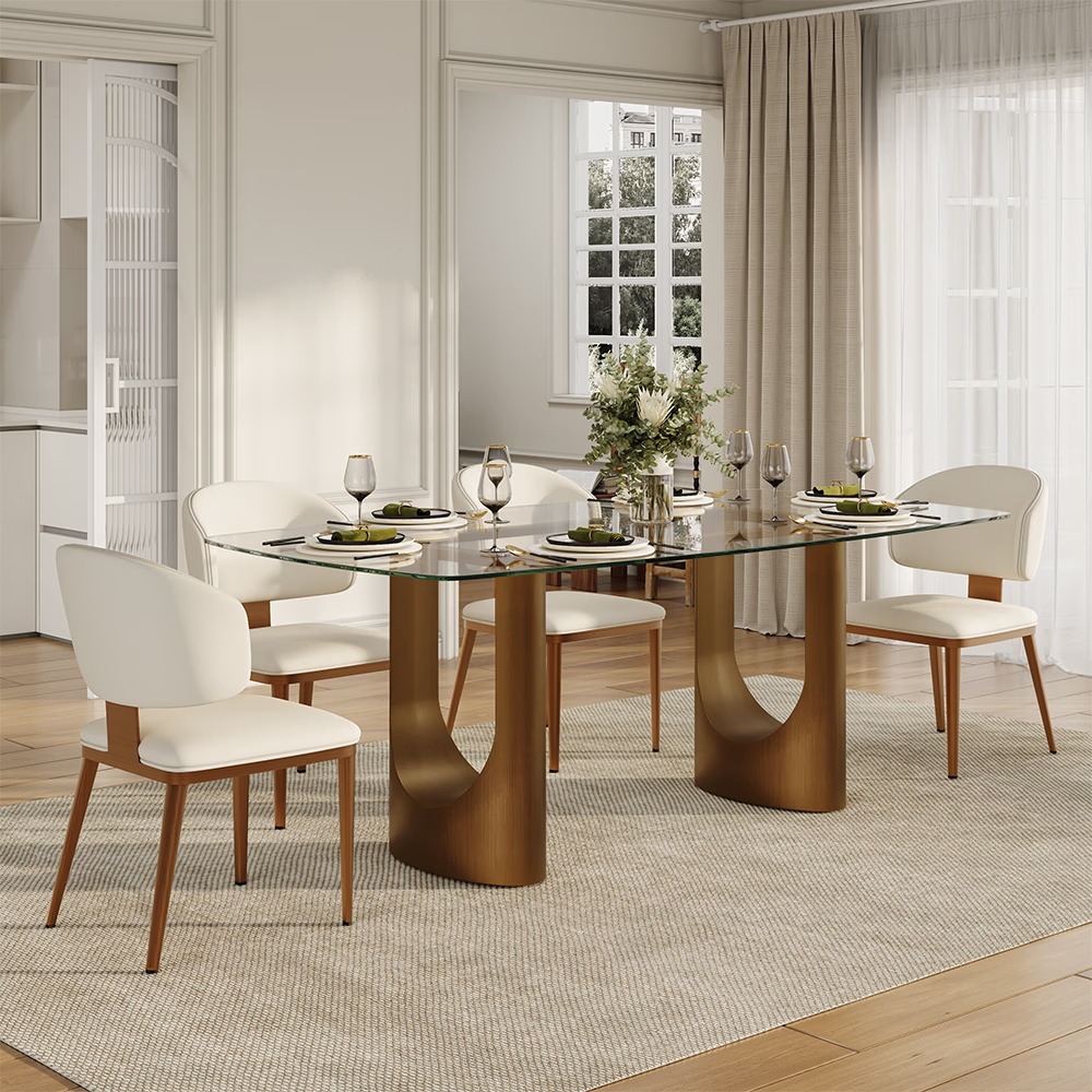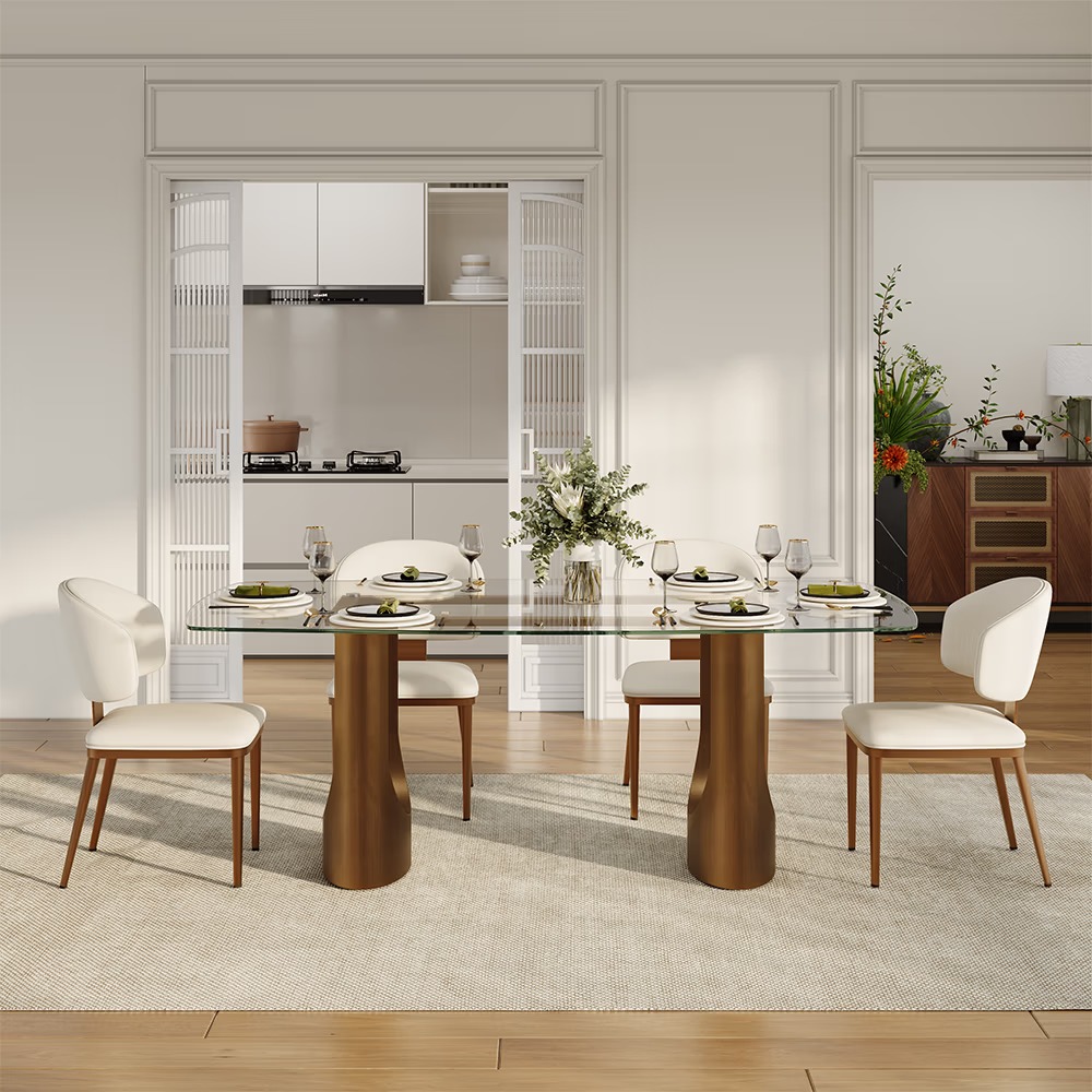 This product is a dining table designed to seat up to six people. It features a glass tabletop paired with a carbon steel base for structural support and stability. The table has a weight capacity of 300 lbs and is not extendable. Partial assembly is required, and all necessary tools are included in the package.