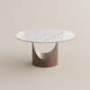 The tabletop is made from 12 mm sintered stone, providing a smooth and durable surface. The base is constructed from stainless steel for structural support. Overall dimensions are approximately 51.18 inches in width and depth, and 29.53 inches in height.