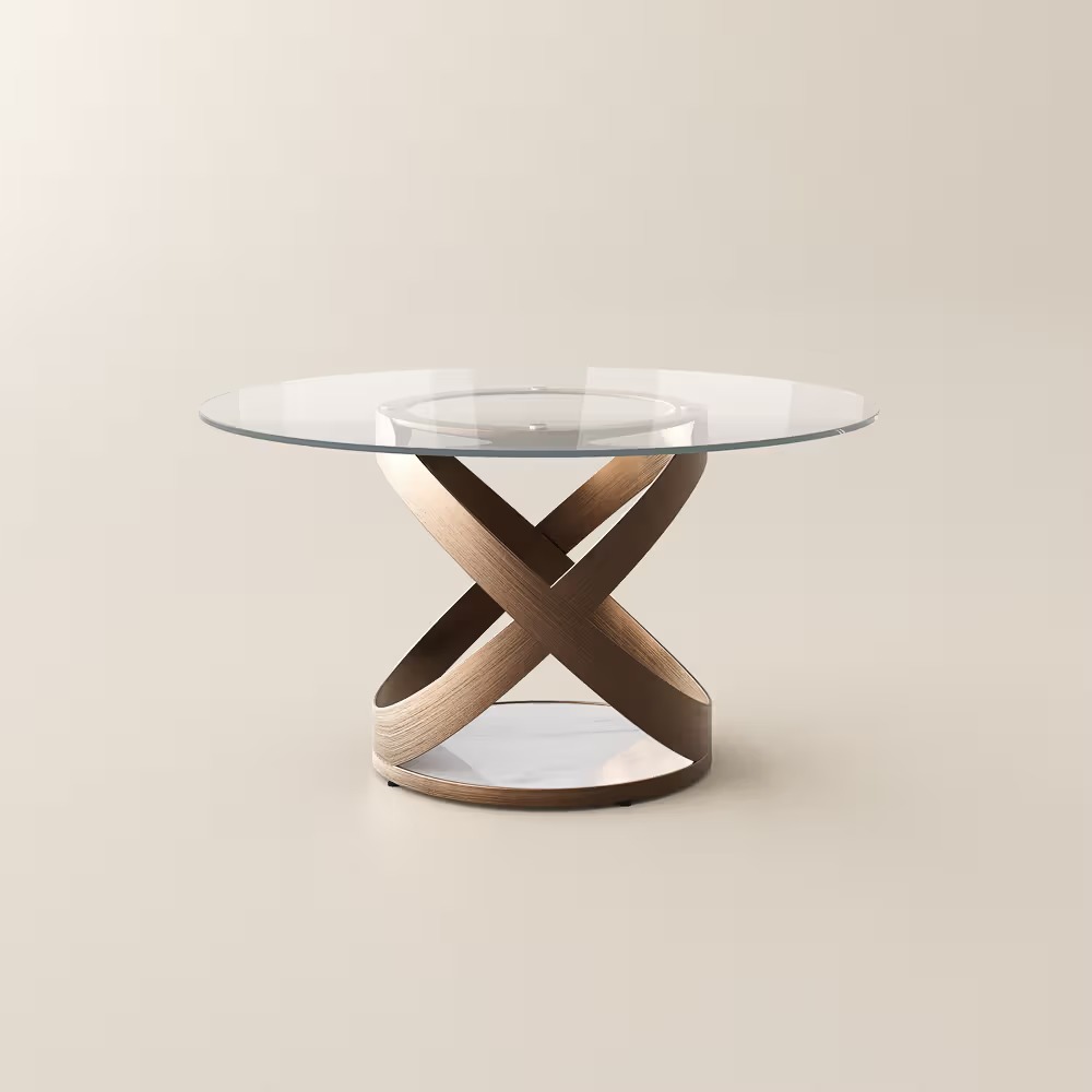 The tabletop is made from tempered glass, providing a flat and easy-to-clean surface. The base is constructed from carbon steel for structural support. The overall dimensions are approximately 51.18 inches in diameter and 29.53 inches in height, with a base size of 27.95 inches in diameter and 24.50 inches in height.