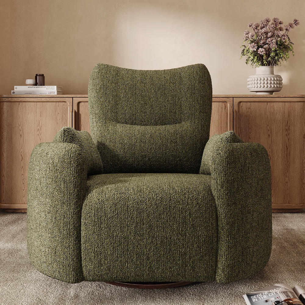 This product is a swivel power recliner chair designed for single seating. It features an adjustable reclining function with a power mechanism, allowing the backrest to move within a range of 90ยฐ to 145ยฐ. The chair also includes a swivel base for rotational movement and comes with three pillows for additional support.